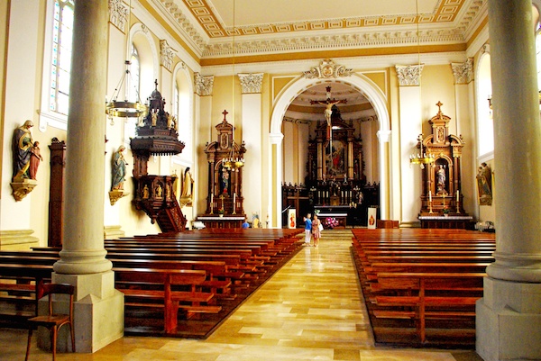 L’église paroissiale Saint-Maurice. Autant l’extérieur est sobre, l’intérieur surprend pour la richesse du décor. L’église a été construite de 1834 à 1837 sur le site d’un sanctuaire plus ancien.